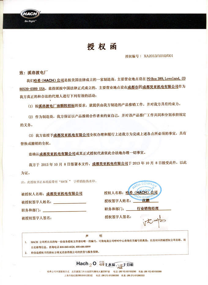 哈希(hach)公司与成都昊亚机电有限公司成为合作伙伴