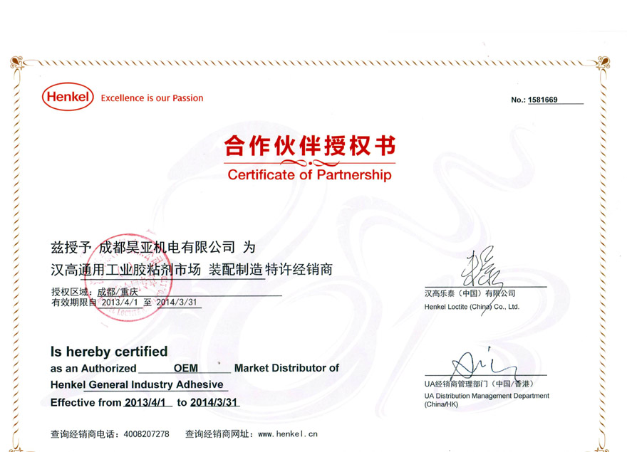 汉高(Henkel)公司授权成都昊亚机电有限公司特许经销商